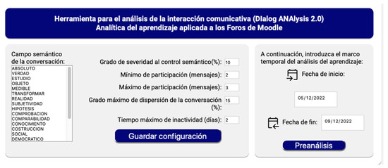 This restructuring has been crucial for specifying and defining the aspects to be analyzed with the DIANA tool. (1) The specific topic around which the discussion would proceed: on this occasion, analysis of the different research perspectives in educational technology. (2) The number of threads making up the discussion. For each of the threads, the following had to be specified: duration of the discussion; the minimum and maximum number of messages per student (between 2 and 3); the semantic field of the conversation (between 20–25 terms); the severity rate of the semantic control (10%); the maximum dispersion rate of the conversation (15%); the maximum inactivity time (2 days) (Figure 3).