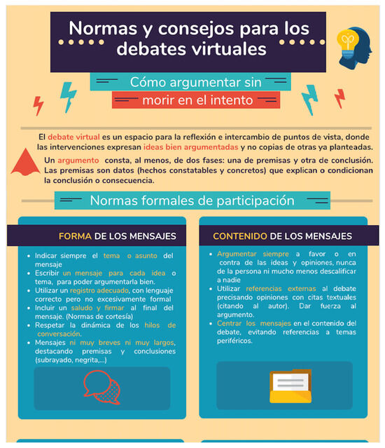 It is important to note that defining some of the parameters listed above was not an easy task due to the lack of previous experience with the tool. Hence, to define the severity rate and the maximum dispersion rate, we followed the recommendations of the research team, taking care not to exceed them by more than 15%. (3) How to present the activity in the virtual space and the specific indications on how to participate in the debate by means of an infographic presentation (Figure 4).