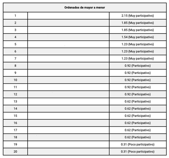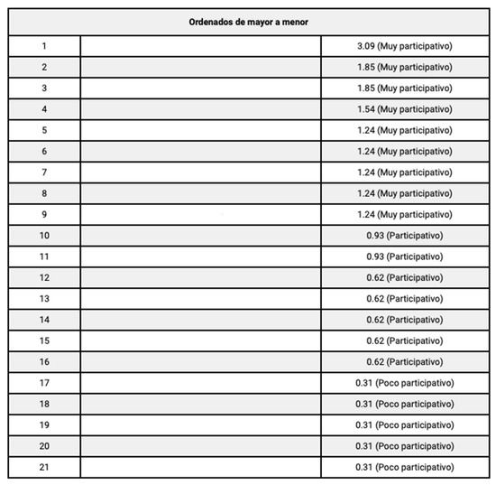 Student popularity rating in the first discussion thread. (Muy participativo = Very participative // Participativo = Participative // Poco participativo = Not very participative).