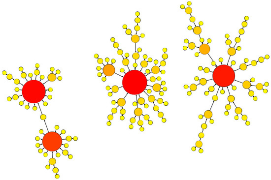 In relation to interaction in communicative participation, all students participated with a total of 177 messages analyzed, obtaining a homogeneity rate of 57.86%, which, while it showed irregular participation by the students, was not excessively skewed from the average. If we focus on the promotion of dialogue, a total of 172 responses were collected, enabling a dialogue level of 97.73%. Figure 11 shows the social network analysis from the students’ interactions in the forum. The graph represents one chain per thread of the forum, and the bigger points highlight messages which have received more responses due to their impact in the conversation.