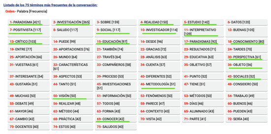 Overall, a total of two files were exchanged and 52 external links collected, meaning that the students became strongly involved in justifying their contributions and responding to the thread raised with other resources not collected in the virtual space. The search for additional information is a clear indicator that the exchange of information encourages others to make contributions. Finally, in Figure 12, we show a list of the 75 terms most frequently used in the discussion. The most significant ones are highlighted in green due to having been included in one of the three semantic fields previously defined by the teacher.
