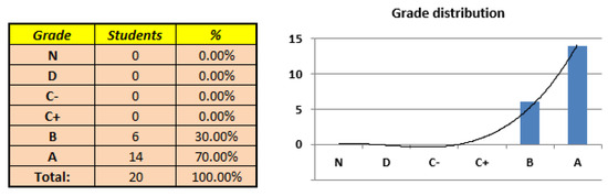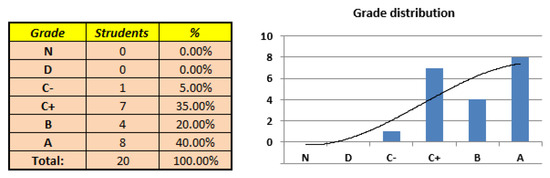Distribution of grades in the subject “Research perspectives in Educational Technology” (experimental group). The black line shows the tendency of the grade distribution.