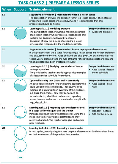 The third column describes whether an element is supportive information (shaded) or a learning task (unshaded) and gives a short description of the element. The elements related to supportive information are shaded, while the learning tasks are not. The task class starts off with supportive information showing participants how this aspect of the task (in this example, to prepare a lesson series) is organized and what steps they can take to execute this aspect themselves (i.e., a SAP). The examples (modeling examples and case studies) are authentic, and the participants also design multiple lesson series of their own. Hence, there is much variability in the learning tasks. For task class 2 (lesson series preparation), there is not much practicing during their own practice, as preparing a lesson series is something that happens relatively infrequently. For task class 3 (preparing a lesson), however, every lesson is a learning task, and thus participants have ongoing opportunities to practice their newly learned skills.