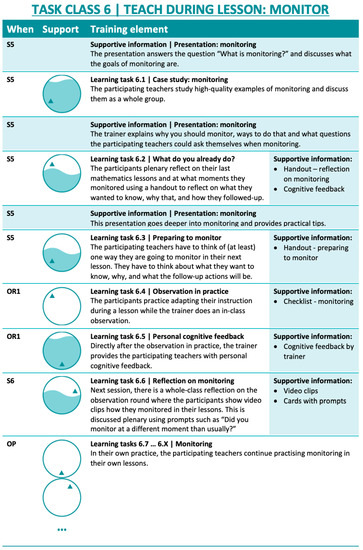The third column elaborates on what the element entails and whether it is supportive information (shaded) or a learning task (unshaded). The task class starts off with supportive information, enabling a shared image of what is meant by “monitoring”. For the learning tasks in session 5, participating teachers study high-quality examples of monitoring, reflect on how they already monitor students, and prepare how they will monitor during an upcoming lesson (i.e., the task class “prepare a lesson” continues and is practiced again during this task class). Teacher support stays high to medium. Next is the observation round, where over the span of 3 weeks the trainer visits each of the participating teachers in their classroom to observe them while they practice “monitoring” during teaching and to provide cognitive feedback, which is feedback focused on fostering reflection for the learner [30]. In the following session, participating teachers and the trainer reflect together on the observation round by watching video clips that show how the teachers practiced the emphasized aspect. Finally, the participants keep practicing the newly learned skills in their in-class lessons for the rest of the TPD program.