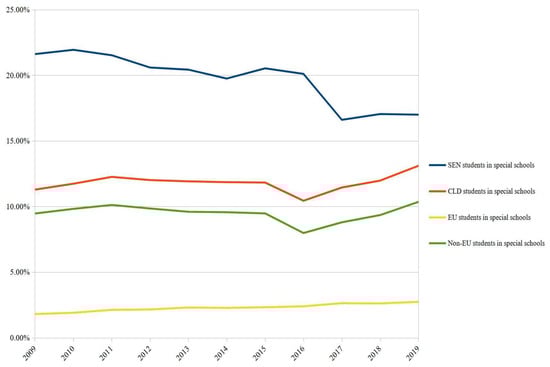 Our study reveals that the percentage comparison between the change in rates of all students with SEN enrolled in special schools and the change in rates of CLD students with SEN enrolled in special schools (Figure 1) clearly identifies two different trends. On the one hand, the rate of SEN students enrolled in special schools continues to decrease over the years, confirming a trend towards increasing inclusive education; on the other hand, the rate of CLD students, especially those from non-EU countries, increases from 11.30% to 13.12%. In contrast, the rate of EU students enrolled in special schools, remains stable throughout the period, showing an almost flat evolutionary line.
