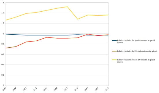 First, students were disaggregated according to whether they were from the European Union or outside the EU. The relative risk index (RRI) was used to compare the risk of ending up in a special education route for each minority group (students from EU and outside the EU) versus the risk for the majority group (Spanish students). The RRI is expressed as the coefficient between the risk of being enrolled in a special education school and the risk of being enrolled in an ordinary school for each analysis group (RRI = 1 when the RRI is the same in the group of analysis as in the reference group). Next, the variable of origin was interacted with the gender variable to see if this interaction led to a change in the composition of students enrolled in special education. Finally, trend lines most appropriate to the data were analysed using polynomial functions in order to define the change in rates of special education students from 2009 to 2019 and also to understand possible changes in the inclusion process.