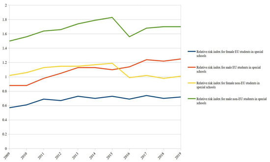 In order to identify other possible gaps, gender and student origin were interacted in a combined way in the configuration of the special education school student body in the period 2009–2019. Taking into account the interactions between origin and gender substantially increases the explanatory power of the model, as it highlights important variations in RRIs, especially for males from non-EU countries (Figure 3). In fact, our study reveals that, if we interact the data of these students with that of EU males and females and with that of non-EU females, these students are the most overrepresented in special education, reaching an RRI = 1.83 in 2015. Therefore, with an average RRI = 1.67, these students are much more likely to attend a special school than Spanish male students. This disproportion is particularly evident when considering the low RRIs of female students from the EU, who, with an average RRI = 0.69, are three times less likely to receive special education compared to male students coming from a non-EU country. It should also be noted that the situation of EU male students shows an upward trend towards increasing RRIs, although this is only slightly higher than the RRI of Spanish students (RRI = 1). These students end the period outnumbering the RRIs of female students from outside the EU. However, these female students continue to have higher RRIs (average RRI = 1.08) of attending a special school compared to female students coming from an EU country (average RRI = 0.69).