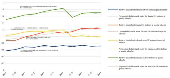 The resulting polynomial equations shown in Figure 4 point out very slight inclines/declines, indicating little increase or decrease on the y-axis for each unit increase on the x-axis, i.e., in each year of the period 2009–2019. This result indicates that the status of CLD students remains constant over 10 years, with no significant changes in the distribution of special education school students. Therefore, the condition of inequality that affects especially male non-EU students does not change, as they have a higher RRI of being placed in special schools.