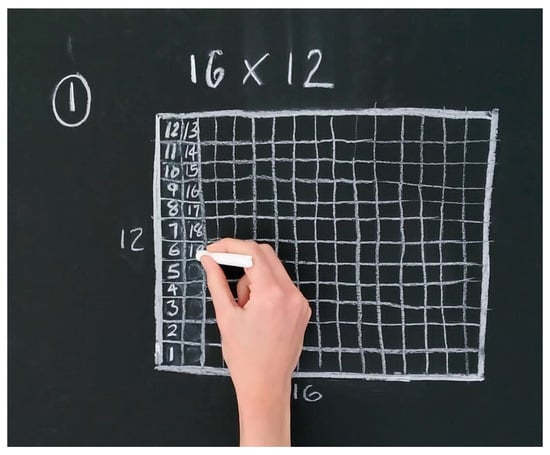 Figure 1. Touch-counting strategy used to find the total number of squares of a 16 × 12 rectangle. Reproduction of classroom board work.