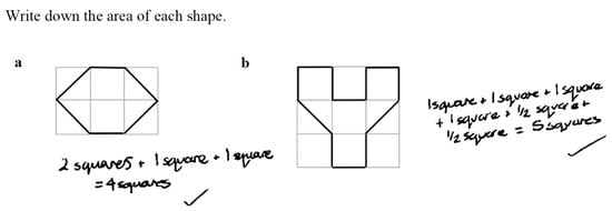 In 2003, as part of my master’s degree, I conducted a small-scale study with two lower attaining Year 9 groups. I carried out a short pre-test requiring students to find the areas of a rectangle, triangle, parallelogram, and compound shapes, all presented on plain paper, with side lengths labelled. The test also included four non-standard figures presented on squared paper. The average score was 3.5 marks out of 12. A close inspection revealed that students were most successful when finding the areas of shapes presented on squared backgrounds, using strategies of piecing together half squares to make full squares before totalling or by counting and accumulating full and half squares, as shown in Figure 2a,b, respectively.