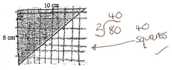 I tested the students again on the same questions at the end of my intervention. The images in Figure 4, Figure 5 and Figure 6 illustrate some of their approaches. For triangles, the preferred method was to draw in the squares to make full rows even though these extended beyond the triangle boundaries, as shown in Figure 4. Students were then able to argue that the triangle used up half of the squares.