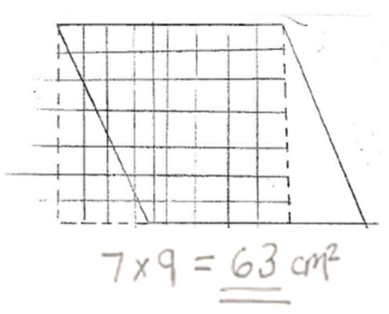 Similarly, for a parallelogram, students drew a full row of squares along the top length, as illustrated in Figure 5, and repeated the rows directly underneath to form the rectangle of equivalent area.