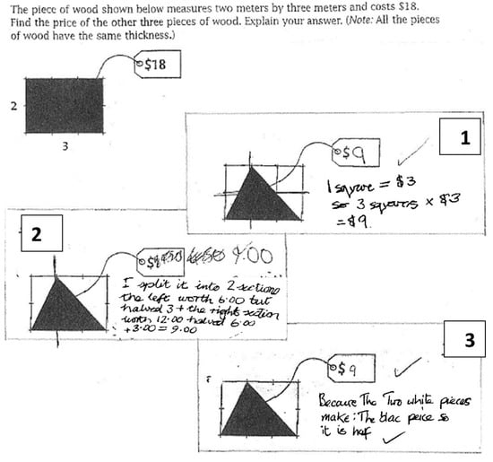 In Figure 7, a question taken from the Reallotment Teachers’ Guide asks students to find the price of pieces of wood given that the rectangular piece costs $18. Students are not required to know any area formulae—this is not an application problem. This context and the presentation provoke a range of naturally occurring but conceptually different approaches. Strategy 1 is to draw in the background squares, figure out the price of one square of the wood, and recognise that the triangle covers three of those squares. Srategy 2 is to draw a line splitting the original triangle into two smaller right-angled triangles, then see each separate triangle as a half of the corresponding rectangle. Strategy 3 provides a logical reason for seeing the black triangle as half of the original rectangle. In my class, students offered this range of strategies and it was possible to see some students shifting towards more contracted/global strategies, e.g., the area of any triangle is half of that of the surrounding rectangle/parallelogram. Through exposure to several context-based problems and by sharing their informal approaches under the guidance of the teacher, learners gradually become ‘a little bit more advanced in mathematizing the problems’ ([] p. 15).