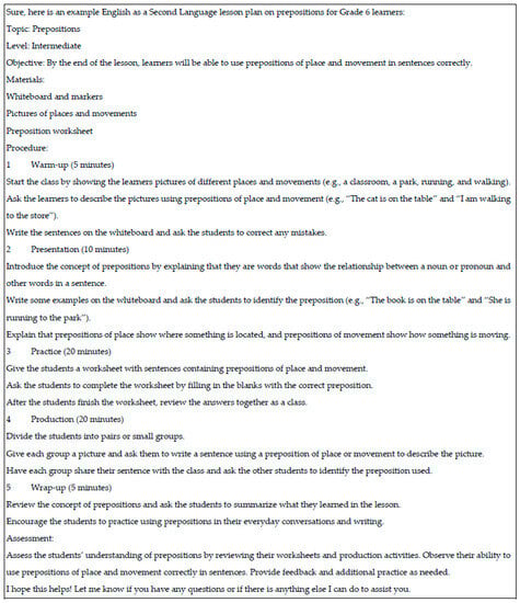 The above lesson has the basic elements of a lesson plan (Figure 1), stating the lesson’s purpose; providing a warm-up exercise; then a presentation, practice, production, and wrap-up; and ending with an assessment activity. ChatGPT was thus able to create an acceptable basic lesson plan. The lesson also has guidelines for the time to spend on each stage. It has the potential to be adapted to suit the needs and the context of the teacher and the learners. For example, the level in the example lesson is indicated as “intermediate” and can be adapted to suit, for example, fast learners. In response to a ChatGPT-generated 6th-grade lesson on the causes of climate change [21], some teachers (see Section 4, document analysis) argued that the lesson was outdated, while others indicated that it only provided a framework that still needed sources. One teacher added the analogy with a recipe which still needed a chef. However, all agreed that the lesson provided a framework with the basic ingredients to save the teacher’s time. The guidelines in the lesson are precise, such as the activities indicated during warm-up: