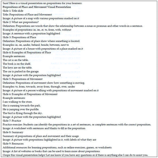 As shown in Figure 3, we prompted ChatGPT further by asking for a visual presentation [10]. Such a presentation could be used to facilitate a lesson on PowerPoint or a similar presentation program or on electronic whiteboards. ChatGPT provided specific guidance on the content, such as pictures and sentences, to add to the different slides. It even suggests additional resources, namely online exercises, games, worksheets and additional websites and books to learn more about prepositions.