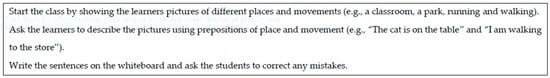 Examples of activities in the ChatGPT preposition lesson plan [10].