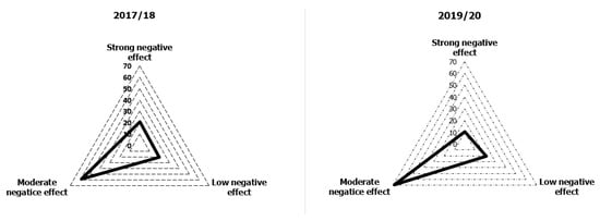 Distribution of statements (%) that described the relationship (strong effect, moderate effect and low effect) between the Myna and the Lesser Kestrel in 2017/18 (right) and 2019/20 (left).