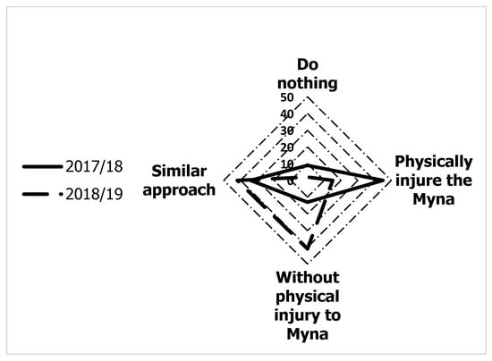 Students suggested four ways to resolve the conflict between the Myna and the Lesser Kestrel (Figure 2). In 2017/18, the preferred solution for about 44% of the students (compared to about 15% in 2018/19) was to physically injure the Myna. The solution included the use of words bearing strong negative emotion: “death”, “dissolvement”, “hunting” and “they (Myna) deserve to die”. One of the students (2018/19) describes his opinion: “The Myna takes the nesting boxes of the Lesser Kestrel ... and if they see a LK chick in the box, then they take it and kill it. I think the Myna should be killed”, or another student (2017/18) explains: “Because it is an invasive species it is allowed to harm its chicks”. One student (2018/19) had the same opinion as the students from 2017/18: “The Myna should be harmed in every way so that they do not interfere with the Lesser Kestrel”.