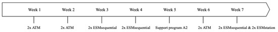 A selection of team teaching models based on the growth path [42] was made in dialogue with the College of Education to implement this new format of student teaching. Student teachers of the team teaching and the team teaching with support interventions were asked to implement various team teaching models. They were instructed to follow a sequential approach, starting with four iterations of the assistant teaching model (ATM) followed by an equal number of iterations of the equal status model of sequential teaching (ESMsequential). Subsequently, two additional iterations of both the assistant teaching model and the equal status model of sequential teaching were implemented. The sequence ended with two repetitions of the equal status model of station teaching (ESMstation), as shown in Figure 3. In the application of the assistant teaching model, each team teacher performed three lessons as the main teacher (with the other partner assisting) and three lessons as the assistant (while the other partner was teaching). Subsequently, in the application of sequential teaching, each team teacher taught different learning content in turn. Finally, in the implementation of station teaching, the class was divided into subgroups and each team teacher taught different learning content to a subgroup, followed by subgroup rotation. Notably, the teaming model was intentionally omitted due to its complexity and the constraints of the limited time available in the second semester.