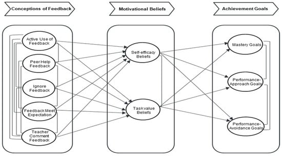 Feedback also serves as the currency through which classroom goals are communicated to students by instructional practices, informing students of what outcomes in learning are rewarded, approved, and anticipated. Thereby, students are affected by how they perceive this information about outcomes toward possible adjustments to their achievement motivations. Classroom goal structures [], depending on how students interpret them, serve as an external force to orientate their intentions towards pursuing different outcomes [,]. Conceptions of feedback reflect subjective agencies of how students interpret learning requirements and task properties through participating in assessments and obtaining feedback from teachers, peers, or themselves on their performance to draw new inferences about the value of different tasks and personal abilities, resulting in changes to their initial value and self-efficacy beliefs and goal orientations in the face of new task situations.