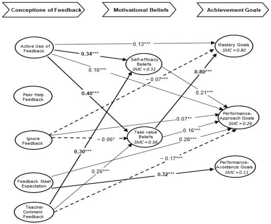 The schematic diagram of the structural relationship between students’ conceptions of feedback, motivational beliefs, and achievement goals; items and factor intercorrelations were removed for simplicity; values are standardised β coefficients; bold lines denote β > 0.30 and dash lines denote negative values; SMC = squared mean correlation, also known as R2; * p < 0.05, ** p < 0.01, *** p < 0.001.