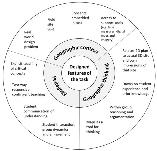 This task combines content, geographic thinking and skills with careful pedagogical choices to foster student conceptual development and spatial thinking (Figure 1). Applying the Jo and Bednarz Spatial Thinking Taxonomy [], this task required students to engage in spatial thinking at lower through to higher levels because students will use spatial concepts that range from primitives (location) through to complex spatial (scale, gradient), use maps as the tool of representation, and use processes of reasoning covering input (listing, observing, selecting), processing (categorising, comparing, contrasting) and output (creating, designing, judging) cognitive functions. The task embeds geographic concepts both explicitly, as the production of a scaled map directs students to consider scale and symbols, and implicitly through the specified core parameters. For example, ‘commerce’ and ‘appealing to wide range of users’ leads students to consider relative location within the site and wider neighbourhood, ‘accessibility’ leads to consideration of people’s movement through the site given slope and topography, while aspects of ‘sustainability’, such as the siting of solar panels or vegetable gardens to maximise sunlight exposure, may trigger consideration of direction.