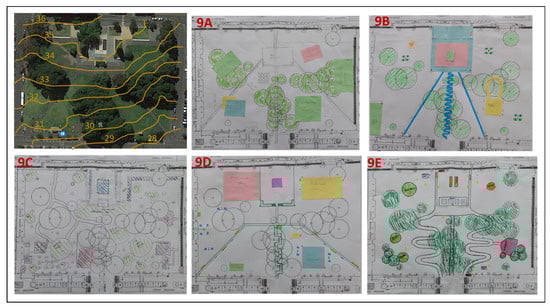 Aerial photo of the park as it was at time of the site visit in December 2018 (top left), with yellow one metre contour lines overlaid, and the students’ final designs for the park. Labels 9A, 9B, 9C, 9D and 9E refer to the group that produced the design. Image of Lincoln Square sourced from Google Earth.
