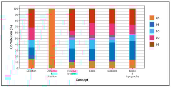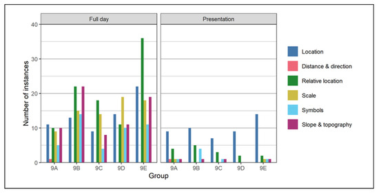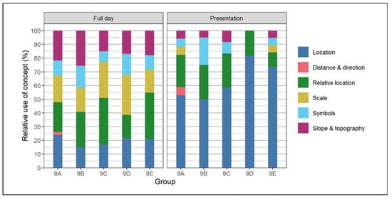 Across the total video footage covering Sessions 2–4 and the group presentations, there were 356 instances where the focal geographic concepts were used by students. The most evident concepts were ‘relative location’ (27% of instances), ‘scale’ (21%), ‘slope and topography’ (20%), ‘location’ (19%), ‘symbols’ (12%), and the least evident was ‘distance and direction’, with only one instance recorded. Overall, groups 9B and 9E referred to the concepts most frequently, responsible for 24% and 30%, respectively, of all instances, which was almost double the references to the concepts made by groups 9A and 9C. Group 9E made more than 30% of the references to ‘location’ and ‘relative location’ while 9B made more than 30% of references for ‘symbols’ and ‘slope and topography’ (Figure 3). Together, 9E and 9B accounted for 60% of the instances for ‘slope and topography’, ‘relative location’ and ‘symbols’. Group 9A was the sole group that mentioned ‘distance and direction’.