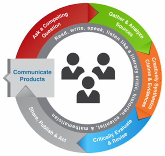 PBI Global has five phases (see Figure 1) in which learners work together in small groups to investigate and develop solutions toward meeting the 2030 SDG targets. As teachers and students prepare for inquiry, attention must be given to activating and building students’ background knowledge on PBI Global content (i.e., the SDGs) and the inquiry process itself [20]. Students then apply this knowledge as they ask a compelling question aligned with their specific SDG interests. These questions can be comparative, solution-oriented, and/or action-oriented and propel students to dig deeper into their SDG-aligned topic of interest [19]. Once student groups have a fairly well-defined question directing their inquiry, they gather and analyze digital and print sources, and sometimes engage in original data collection, related to their question. The information that students gather and analyze is then creatively synthesized into claims and evidence in written and visual forms [5,21]. Throughout the inquiry process, students engage in multiple feedback loops to critically evaluate and revise their research question, sources, findings, and learning products. Students then have the opportunity to communicate their products to a larger audience and take social action (i.e., share, publish, and act). For more detail regarding PBI Global design and implementation, see Spires [5] and Himes [21].