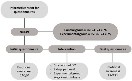 This study used a quasi-experimental design with convenience sampling, involving two groups, one control, and one experimental, and two evaluation times (pre- and post- intervention). The intervention was based on the development of a didactic unit on Block 5, expressions of motor culture, which consisted of 6 body expression sessions, each lasting 50 min, and was developed at the end of the second quarter (Figure 1). To determine if the planned intervention influenced students’ emotional awareness, classes were divided into two groups. A control group worked on the previously mentioned sessions, and an experimental group’s intervention was based on the development of the same didactic unit, with the peculiarity that in the warm-up of each of the six sessions, a part of yoga based on sun salutations and mindfulness with breathing and relaxation techniques was performed. Additionally, with the experimental group, the first session was devoted to the practice and understanding of the most basic aspects of yoga. Both before and after the unit’s development, students completed a questionnaire to assess their emotional awareness. The necessary authorization was requested from the management team of the selected center, and the period for completing the questionnaires was agreed upon. The questionnaires were administered during the students’ Physical Education sessions, specifically at the beginning and end of the didactic unit related to the basic knowledge of Block 5 and expressions of motor culture, as reflected in Royal Decree [28], which refers to the LOMLOE [27]. The necessary instructions were given to complete the questionnaire, emphasizing the sincerity and honesty of their responses. The time required to complete the questionnaires was approximately 5 min.