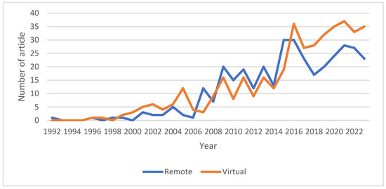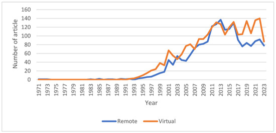 The data were also compared with Web of Science for remote and virtual laboratories. While the Web of Science data started earlier in 1971, it exhibits a similar trend of increasing publications for remote and virtual laboratories over time. Notably, the number of virtual laboratory publications on Web of Science is substantially higher than on Scopus. Overall, the data highlight the evolution of remote and virtual laboratories in academic research, their growing significance in various educational contexts, and their ability to adapt to the changing demands of education, particularly in response to the COVID-19 pandemic.