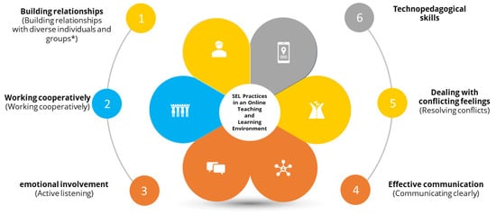Accordingly, the current study contributes to theoretical and practical knowledge by identifying the need to adapt the existing CASEL model to address the needs of learning and teaching in an online environment. Such an adaptation process would undoubtedly improve the quality of online learning, and, perhaps no less importantly, it could serve to enhance the education and training of teachers by preparing them to operate effectively and optimally in the online environment [45,46]. The themes in the figure emerged from an analysis of the data provided by the participants, who provided these observations in response to the research questions posed in the course of the interviews, the focus group, or in the questionnaire.