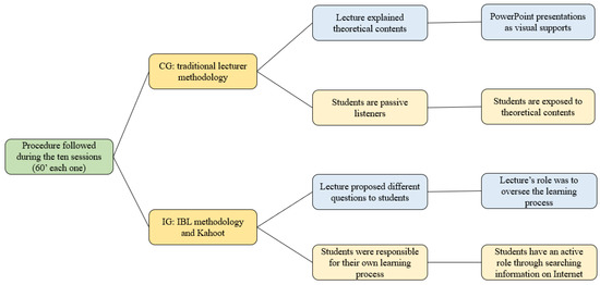 However, the IBL methodology implemented in the IG, using questions to discover what information future teachers needed to find, fostered them not only to learn theoretical contents, but also key competences such as learning to learn and ICT competence, since pre-service teachers had to search for information on the Internet. Finally, at the end of each lesson, the last few minutes of each session were devoted to the completion of a Kahoot activity with different questions about the key concepts worked on during the lesson. Hence, it was during the last few minutes of each session that LA was applied. In that way, not only did pre-service teachers become responsible for their own learning process, adopting an active role by collecting the necessary data to answer the questions posed [57], but a process of continuous monitoring and evaluation of how this learning was taking place was enabled, too [5,19]. During the IG lessons, the lecturer had to oversee the learning process. The procedure followed during the experiment is summarized in Figure 1.