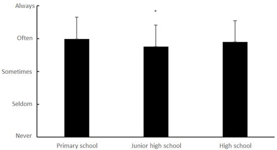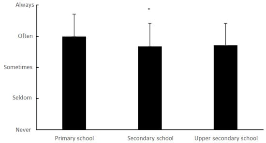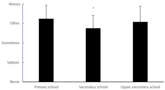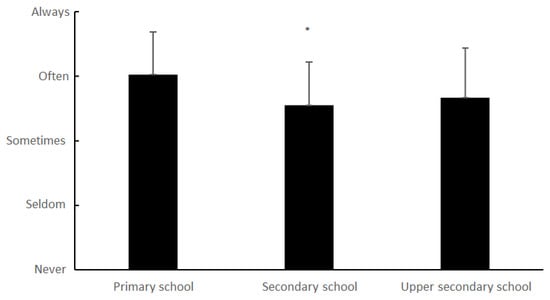 Teachers’ experiences of how often students with DSMD are contacted and included by other students. * Indicates a significant difference between secondary school teachers and, respectively, primary school teachers and upper secondary school teachers at the p < 0.05 level.
