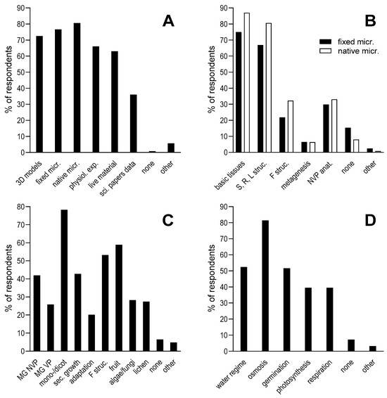 Answers to questions (A) “What types of teaching aids do you use in plant biology education?” (3D models = plastic/acrylic models, fixed micr. = fixed microscopy, native micr. = native microscopy, physiol. exp. = physiology experiments, live material = macroscopic observation of live material, sci. papers data = data from scientific papers), (B) “What topic do you use native/fixed microscopy for?” (S, R, L struc. = stem, root and leaf structure, F struc. = flower structure, NVP anat. = anatomy of non-vascular plants), (C) “What topic do you use live plant material for?” (MG NVP-VP = metagenesis of non-vascular plants/vascular plants, mono-/dicot = monocot/dicot structure, sec. growth = secondary growth, adaptation = ecological adaptations of plants, F. struc. = flower structure, fruit = fruit structure, algae/fungi = algae/fungi thallus structure, lichen = lichen thallus structure), (D) “What topic do you use physiological experiments for?”. Data are a percentage of the total number of respondents (124 teachers). The sum of percentage is higher than 100, as the respondents could choose several answers.