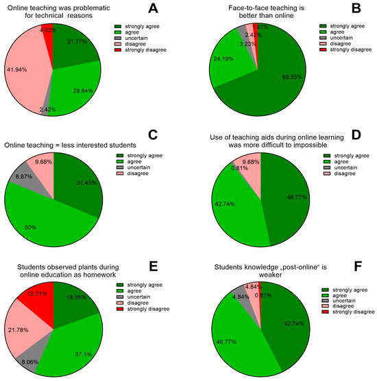 The attitude of teachers was unclear regarding the statement: “Students observed plants during online education as homework” (Figure 3E), indicating that some teachers gave plant observation as homework to students, while others did not. Technical problems, reduced student interest, or the less frequent use of aids by teachers could be the reason for the reduction in knowledge after online teaching. A total of 89.51% of teachers strongly agreed that students had less knowledge after online teaching (Figure 3F). Low levels of retention during online teaching were found in several studies [20]. MESRS-SR [21] found that up to 80% of teachers think that students learn more effectively during face-to-face teaching compared to online teaching. Even the students themselves (69.1%) think that online teaching had a negative impact on their learning [37], and the implementation of so-called at-home laboratories [22] may be an efficient tool for the future.