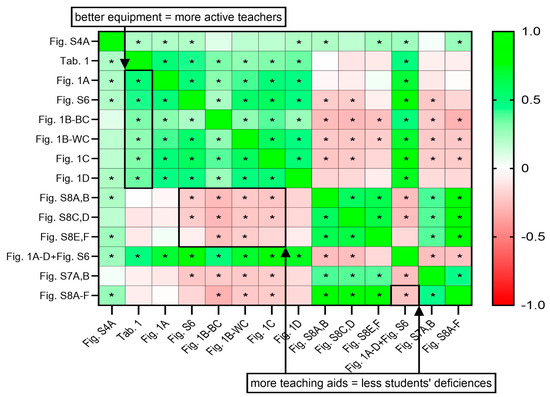 Heat map from Spearman’s correlation analysis of the teachers’ responses to questions in selected areas. To determine the correlation between teaching aids, equipment and activities of teachers versus knowledge of students, respective questions were counted as the number of activities/aids/equipment mentioned by individual respondents from the options offered in the individual questions. * The corresponding correlation in R is considered significant because the off-diagonal element of P was smaller than the significance level of 0.05. Green and red squares indicate significantly positive or negative values, respectively. BC and WC denote black and white collumns in the respective graph. Arrows indicate the main findings of our research in terms of equipment, activity and knowledge gaps.