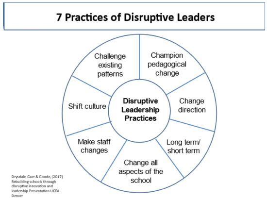 - Drysdale, L.; Goode, H.; Gurr, D. Rebuilding schools through disruptive innovation and leadership. In Proceedings of the University Colleges of Educational Administration Conference, Denver, CO, USA, 15–19 November 2017. [Google Scholar]