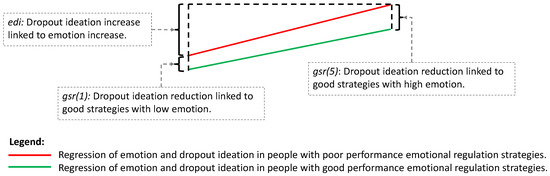 - The reduction in dropout ideation attributable to effective strategies at low emotional levels can be denoted as gsr(1) (good strategy reduction) in Equation (2), gsr(1) being the value at a low emotional level, f45 the emotion and dropout ideation regression line for people with good emotional regulation strategies (responses to strategy performance were 4 or 5), and f45(1) the regression line value at a low emotional level: