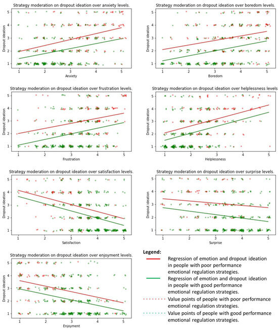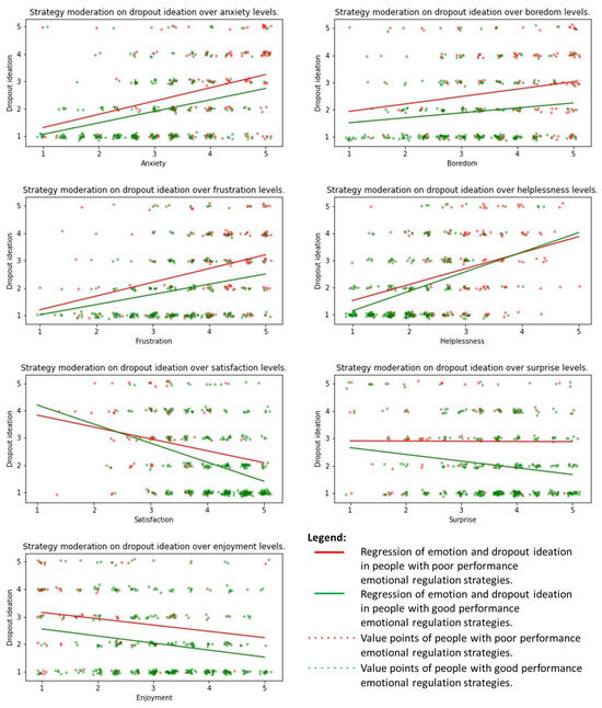 With regard to emotional regulation strategies, they exhibit substantial promise in their capacity to temper the surge in dropout ideation across all contexts and for nearly all emotions. Consequently, this study underscores the imperative for students to cultivate proficient emotional regulation strategies. In broader terms, this aligns with numerous prior studies, advocating for the inclusion of emotional intelligence, which comprehensively encompasses emotional regulation, as a fundamental component of curricula at all educational levels, given its influence on myriad aspects of life, both within and outside the classroom [27,39,40].