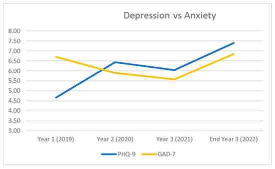 While anxiety scores decreased at the start of year two and year three in the current study, in comparison to the rates reported at baseline, the scores increased at the end of year three. Depression scores also increased even further. Therefore, the time when the survey was conducted must be considered [25]. As most students were coming to the end of their time at college, the increase in mental health issues may reflect increased concern about pending assignments and upcoming exams [25]. Moreover, as the majority of this cohort were completing college, they may have been concerned about making the transition to the next stage in their lives following college [26] and their future prospects. Indeed, many students in this study reported that the pandemic had a very negative impact on their college experiences and plans for the future.