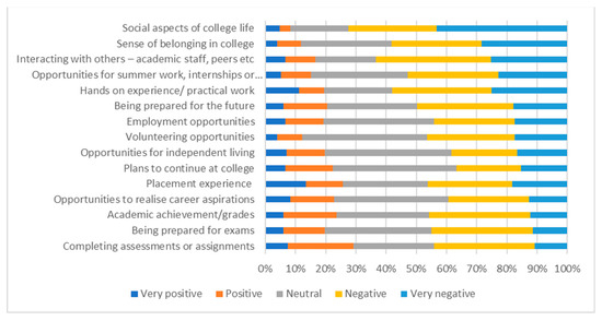 Students (n = 229) were asked how much of an impact they thought the COVID-19 pandemic and the associated restrictions had on their college experiences in a number of areas (Figure 2; Table 3;). As might be expected, the pandemic had very negative impact on social aspects of college life, having a sense of belonging, and having the opportunity to interact with others. Almost three quarters of those surveyed said that it had had a negative (29.3%) or very negative impact (43.2%) on social aspects of college life. Over half of the participants said that the pandemic had had an impact on opportunities for summer work, internships, or exchanges, or that it had impacted on gaining hands-on experience or practical work. However, it should be noted that a sub-group of around 10% of participants said that it had had a very positive impact on obtaining either hands-on experience or placement experience.