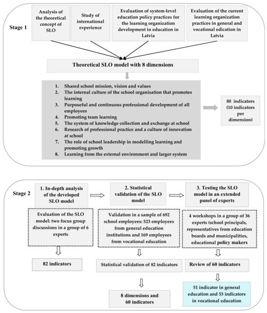 The analysis of the SLO and teacher job satisfaction presented in this article is part of a study in Latvia within the project, “A model and tool to support the implementation of the approach school as a learning organisation in educational institutions”, being implemented within the European Social Fund project, “Establishment and implementation of the Education Quality Monitoring System”, and based on the developed and validated SLO model in general and vocational education in Latvia within this project. The development and validation of the Latvian SLO model was carried out between November 2022 and March 2023 and was implemented in two stages.