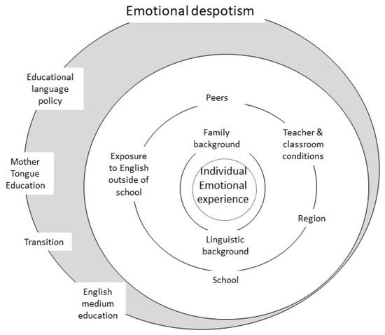 The concentric circles illustrate the proximity between proximal and distal influences on students’ emotional experiences informing language development in the ELE ecosystem [36]. Within the proximal ecosystem, illustrated with a white background, the prime sources of emotions arise from students’ early English language experiences. The synergy between and among the proximal ecosystems such as teacher and classroom conditions can directly influence students’ emotional experiences. Students’ exposure to English beyond the classroom and their place of origin may not directly relate to their emotions, but can be vital for their language development. As part of the distal ecosystem, illustrated with a grey background, the MTE policy aims to enhance students’ language trajectory [2], yet behind the classroom curtains, students experience negative emotions in the transition from MTE to EMI. In the all-embracing distal ecosystem, the absence of emotional affordances due to the existence of emotional despotism in ELE denies opportunities for students’ language development and agency, imposing artificial limits on their identity and selves. The findings, however, suggest that proximal influences and individuals themselves have an important role in mediating distal influences. The negative emotions provoked by the distal language policy, for example, can be softened or reinforced through the actions of the proximal teacher or family. The findings also indicate how students actively participate in the formation of their future self.