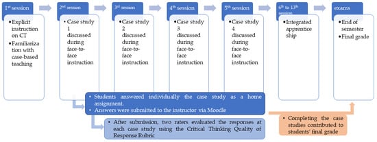 Moreover, the course integrated aspects of CT with the infusion approach. According to [66], infusion refers to the explicit instruction of CT aspects during the instruction of a specific subject matter. Thus, the instructor of the course, who was trained in CT (see [67] for more details on the training), during the first session of the “Teaching approaches of the Environmental Study” explicitly taught students about the nature of CT particularly referring to CT skills and dispositions. After explicit instruction of CT, students were engaged in case-based teaching through structured activities that would foster the application of CT knowledge. In the end, students reflected on the CT skills and dispositions activated during case-based teaching. These activities allowed students’ familiarization with case-based teaching.