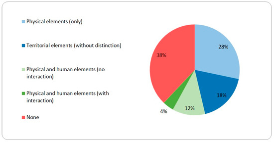 None of the participants gave a full definition of landscape, using the ELC’s definition as reference. Nearly all, however, could provide a partial definition, mentioning at least one component: (i) perceived space, (ii) in a set location, (iii) where physical and human elements interact (Figure 1). The idea of location was the least mentioned, and that of territorial elements the most. Figure 2 breaks down the way these elements were mentioned, almost exclusively from an environmental (physical elements) or an aseptic (territorial elements in general) perspective. Few respondents mentioned the interaction of human and physical aspects.