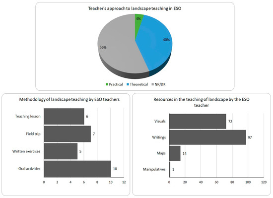 Among those who remembered having studied landscape-related subjects in compulsory secondary education and provided further details, over 90% defined the learning approach as theoretical (Figure 7). Some participants were more specific, and their description indeed suggested a largely theoretical approach, with master classes and written or oral exercises (Figure 7). More participants provided details about the resources used in class, and these were again in line with a predominantly theoretical approach, using written and visual material, rather than more active methods, such as the use of cartography, excursions, or interactive resources (Figure 7).