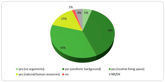 The fact that, despite their only partial perception, most participants identified landscape as a relevant factor in quality of life can be explained through this association between landscape and protected natural spaces, which also play a role in quality of life [21,23]. On the other hand, approximately a third of participants based their positive answers on everyday actions, such as socialisation, leisure, and sport. This emphasises the relationship between the quality of the lived space and the existence of green areas and public areas for socialisation. Concerning the citizen’s role as an agent of landscape, only one tenth considered collective approaches. This suggests a widespread lack of awareness of public participation processes that affect the lived landscape [13].
