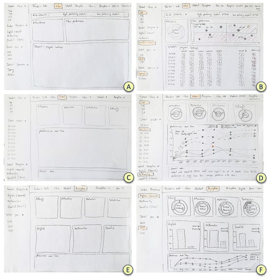 Paper prototype for teacher dashboard. (A) Class view before selecting items from the item lists. (B) Class view after selecting items from the item lists. (C) Student view before selecting items from the item lists. (D) Student view after selecting items from the item lists. (E) Discipline view before selecting items from the item lists. (F) Discipline view after selecting items from the item lists.