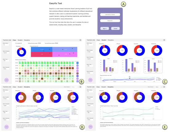 Interactive prototype for the teacher dashboard. (A) Login. (B) Class view. (C) Student view. (D) Discipline view before selecting items from the sub-area list. (E) Discipline view after selecting items from the sub-area list.